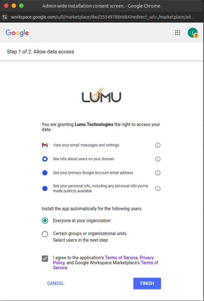 9. The Allow data access window will appear. Here, you will see the permissions required by the integration to work seamlessly. You will need to choose the users you want to install the app for. Choose the one that best suits your needs, accept agreements, and click Finish.