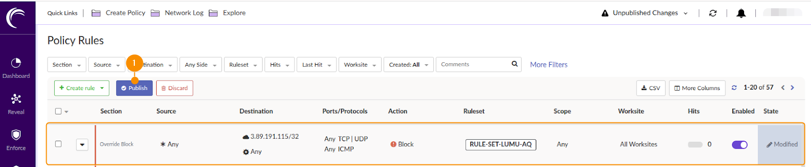 4. Publish your rule changes by selecting your new rule and clicking on Publish (1).