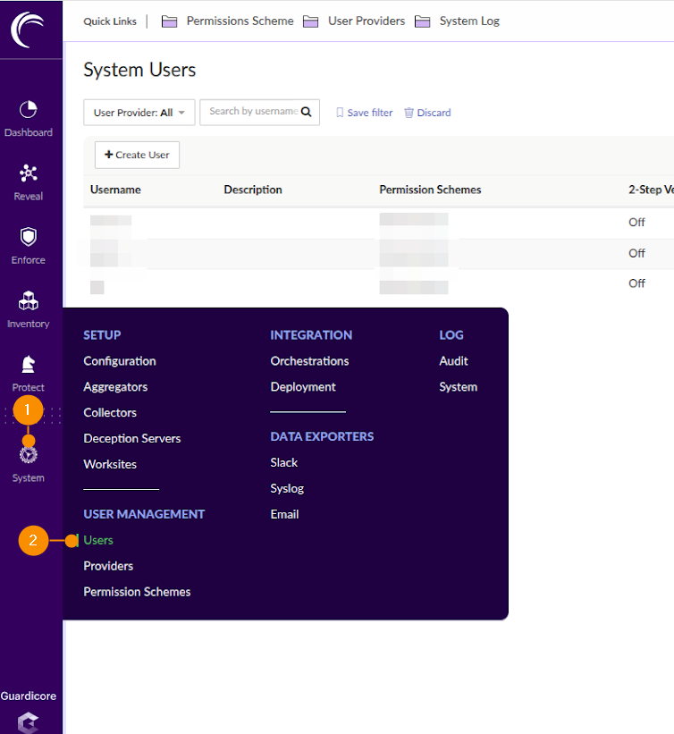 1. Head to the left navigation bar. Expand System (1) and click Users (2) under the USER MANAGEMENT section.