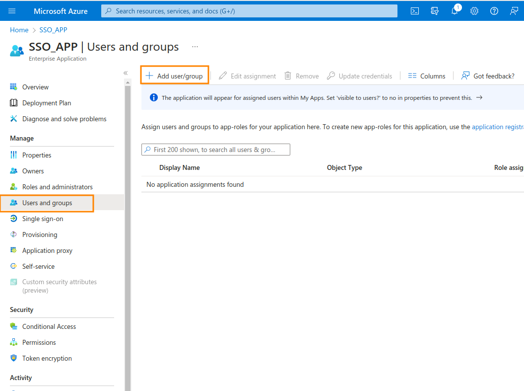 5. Now we need to set up the SAML app. In the left menu, click on Users and groups. Click on Add user/group and proceed to add the users for your app.