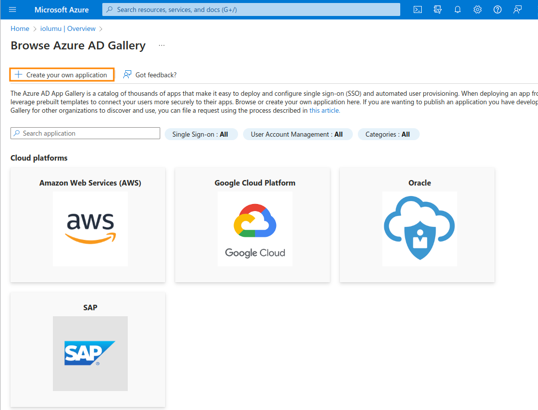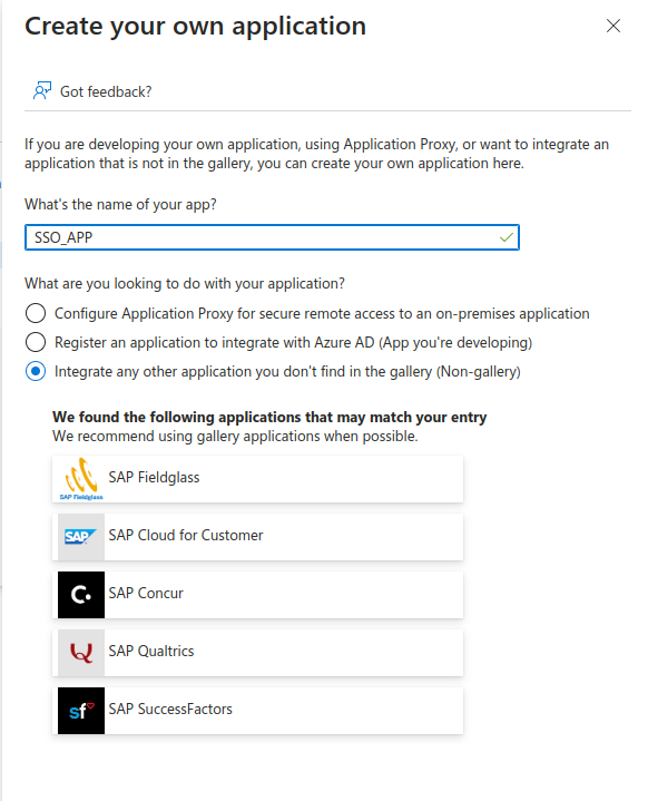 3. Click on the Create your own application button.4. In the pop-up form, give your app a name without any white spaces. Select the option Integrate any other application you don't find in the gallery (Non-gallery). Then, click on the Create button.