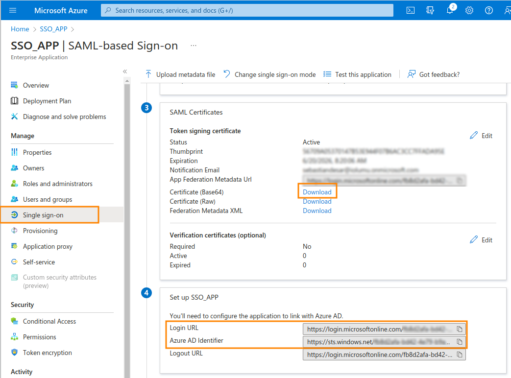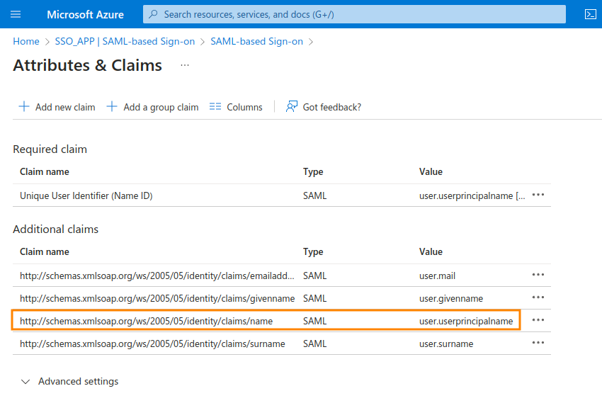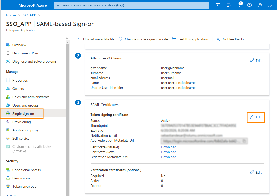 Claim Name: http://schemas.xmlsoap.org/ws/2005/05/identity/claims/nameClaim Value: user.userprincipalname11. Back again in the Single sign-on menu, on the SAML certificates section, click on the first Edit link.