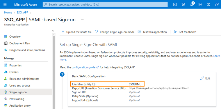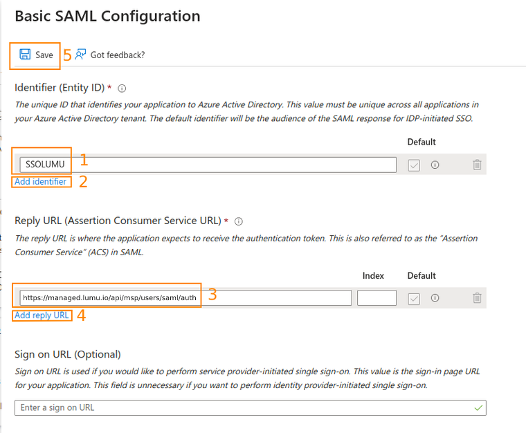 9. On the pop-up form, click on Add identifier under Identifier (Entity ID) and provide a name without any blank spaces. Write it down and save it for later, as you will need to send it. Then, click on Reply URL (Assertion Consumer Service URL) and add the following URL: https://managed.lumu.io/api/msp/users/saml/auth. Click "Save" to proceed.