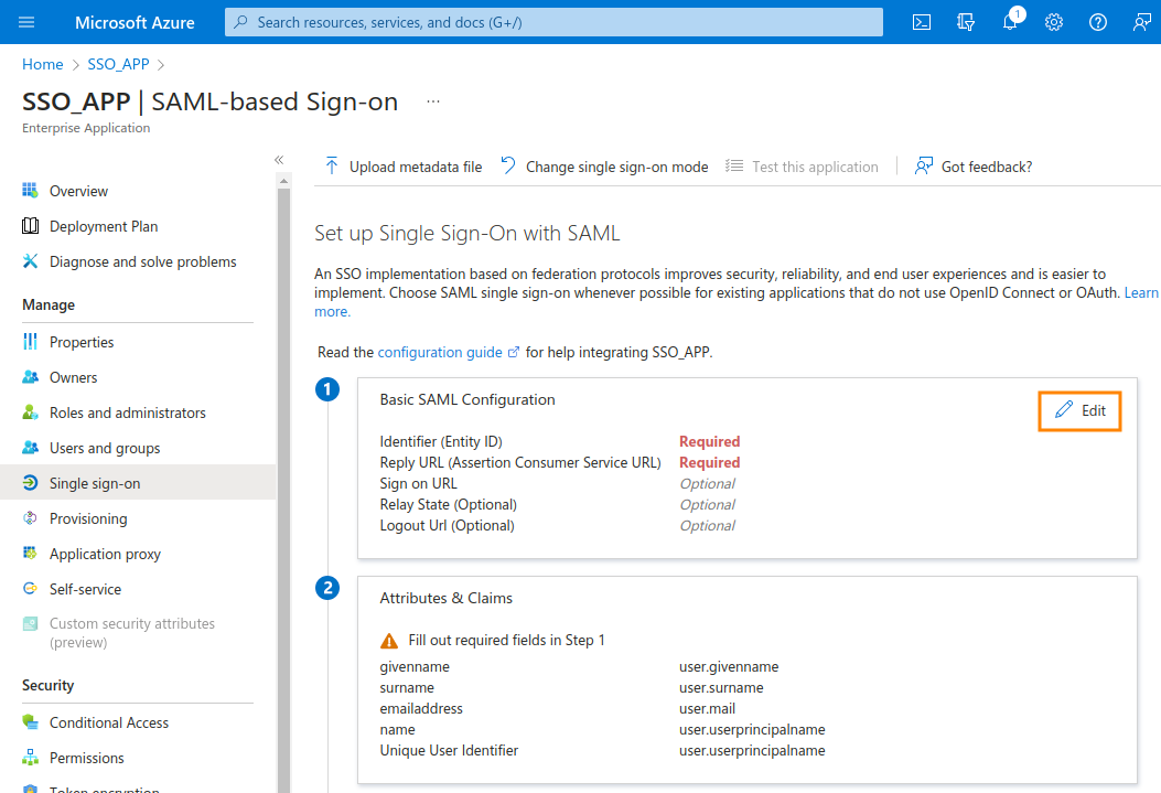 8. Next, click on Basic SAML Configuration on the pen icon to edit.