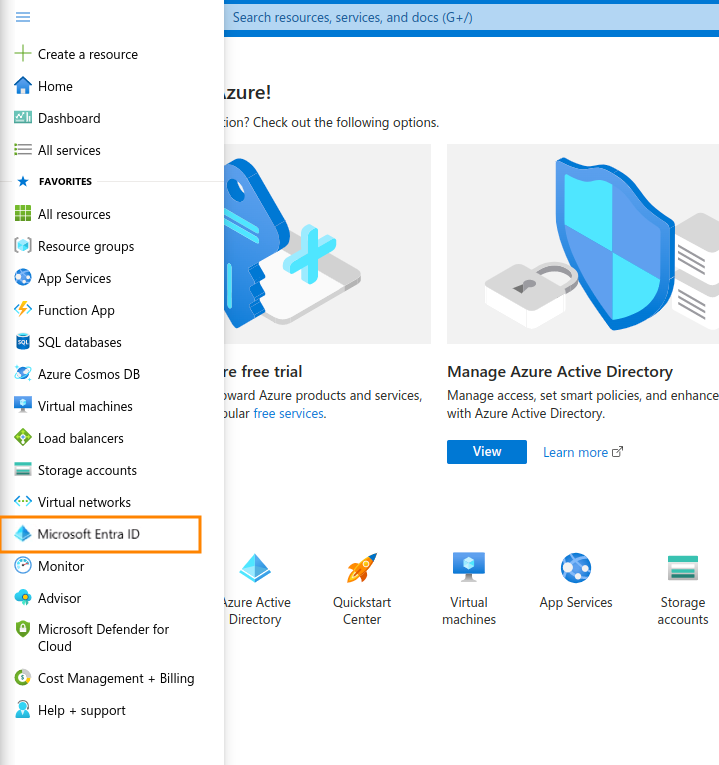 1. Go to https://portal.azure.com/ and log in to your Entra ID portal. Open the left menu and click on Microsoft Entra ID.