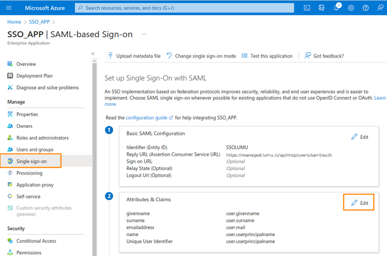 10. Back on the Single sign-on section, click the Edit link in the Attributes & Claims section.