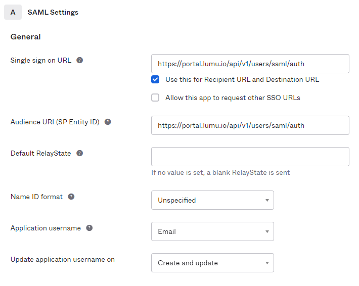 Audience URI (SP Entity ID): https://portal.lumu.io/api/v1/users/saml/auth