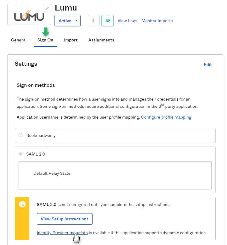6. Back on the Sign On tab, look for an alert indicating that SAML 2.0 will not be configured until the setup instructions are completed. There, click on the Identity Provider Metadata link.