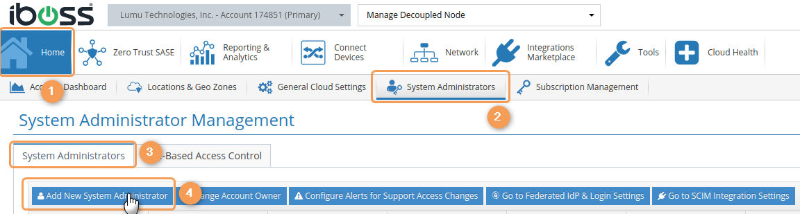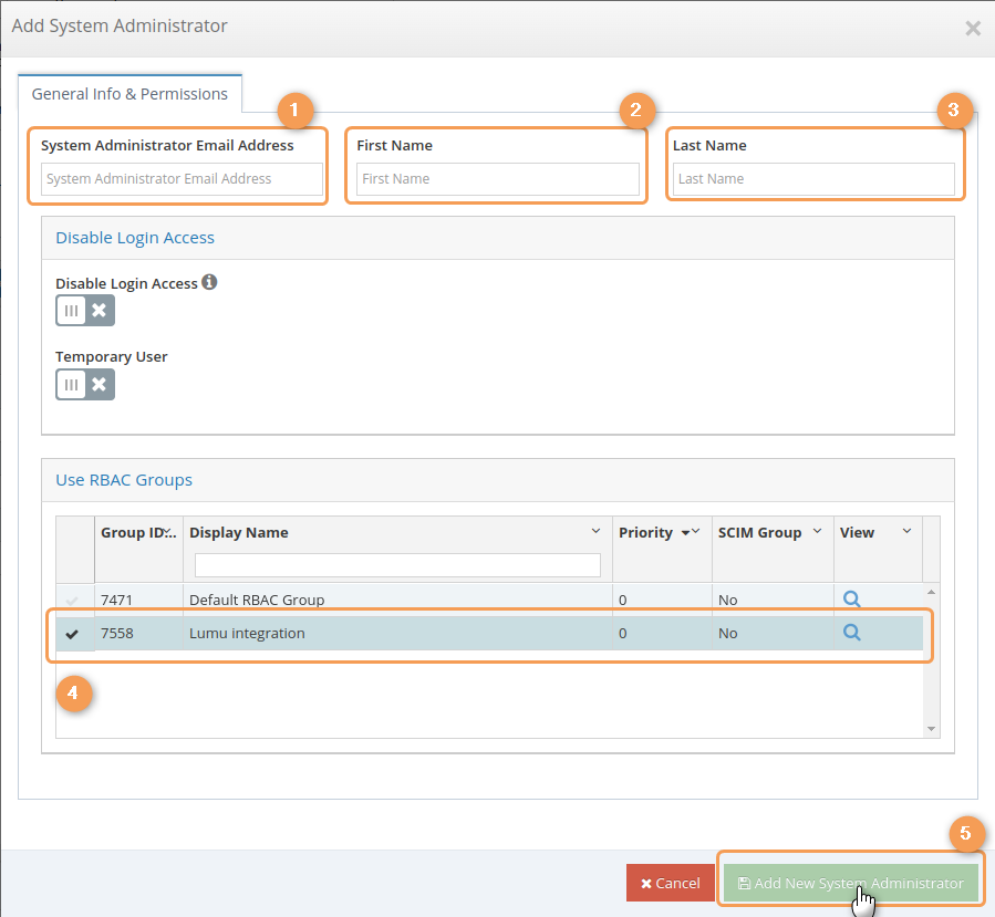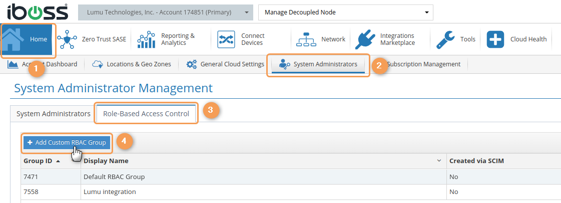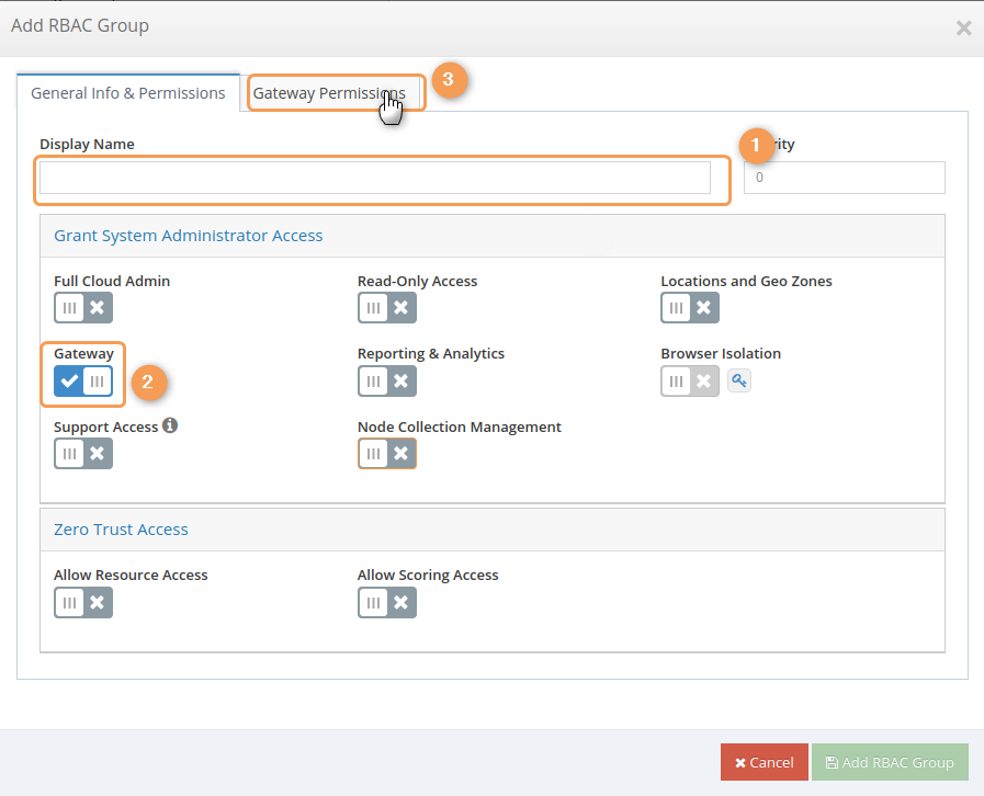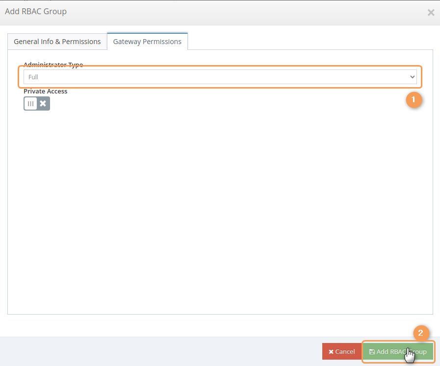 1. On the top navigator bar, click on the Home button. Next, click on the System Administrators tab. Then, click on the Role-Based Access Control menu. Finally, click on the Add Custom RBAC Group button2. Enter a name for your role. Enable only the Gateway toggle under the Grant System Administrator Access. Click on the Gateway Permissions tab.Take note of the custom role name. It will be required later3. Select the Full option in the Administrator Type field. Save the custom role by clicking on the Add RBAC Group button