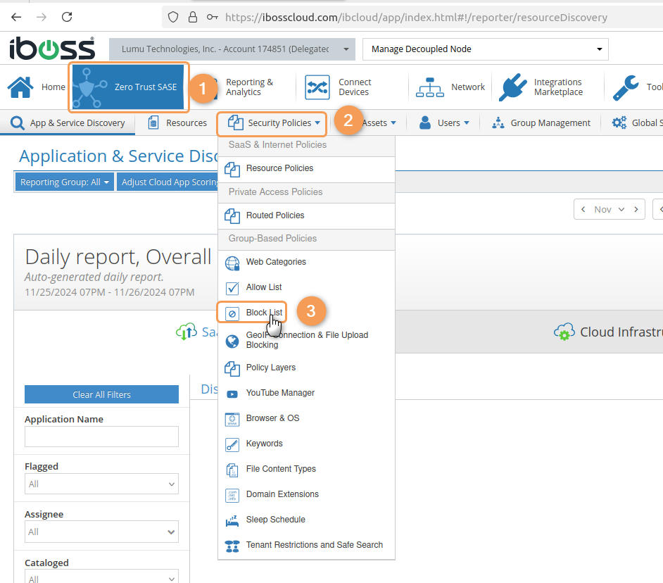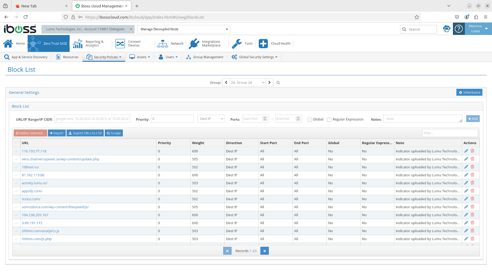 1. Login to iboss Cloud.2. Click on Zero Trust SASE and then on Security Policies. Under the Group-Based Policies heading, click on Block List3. Use the group navigator found in the upper middle of this panel to find the groups you selected in Step 6 of the Integration Setup - Lumu Portal section. Here, you can:a. Move forwards or backwards to find the group you assigned the integration to push IOCs to.b. Use the magnifying glass to specify a name in its text field.If you chose to push IOCs globally, then any group will serve as a way to verify that the integration is functioning properly.4. When you have found the group you want to verify the integration for, you will see the following screen, where you can verify that IOCs are being pushed to your selected group.
