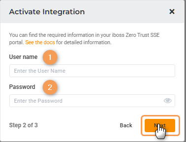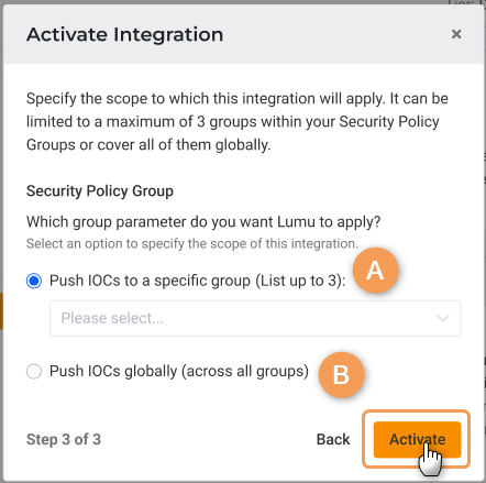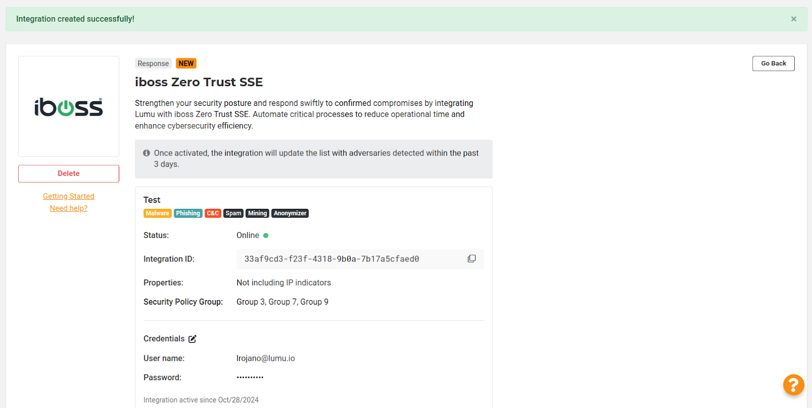 If you leave the Include IP Indicators option unselected, you won’t be able to change it later. You will need to remove the integration and repeat all the steps again.5. Fill in the User name and the Password for the iboss account the integration is being set up for.a. The User Name is the same email address you introduced in Step 2 of Create a user for the integration section.b. The Password is the password you defined in the email you received in Step 3 of Create a user for the integration section.Click the Next button. Lumu will validate if the credentials provided are correct.6. In the following window, you will be asked to select one of two options:a. Select a maximum of 3 groups within your Security Policy Groups where the indicators will be pushed to. The drop-down list will populate with the groups already set up on iboss Zero Trust.b. You can select to push them globally. This will push indicators to all groups already set up on iboss Zero Trust.Once done, click on the orange Activate button.7. The integration is now created and active. The Lumu Portal will display the details of the created integration