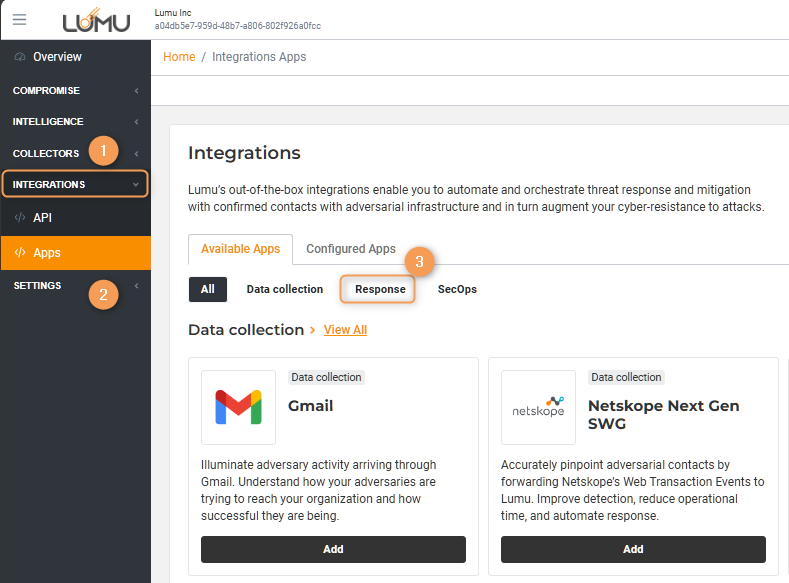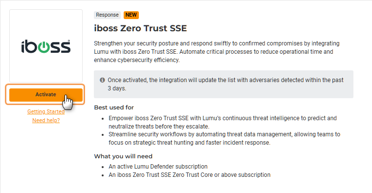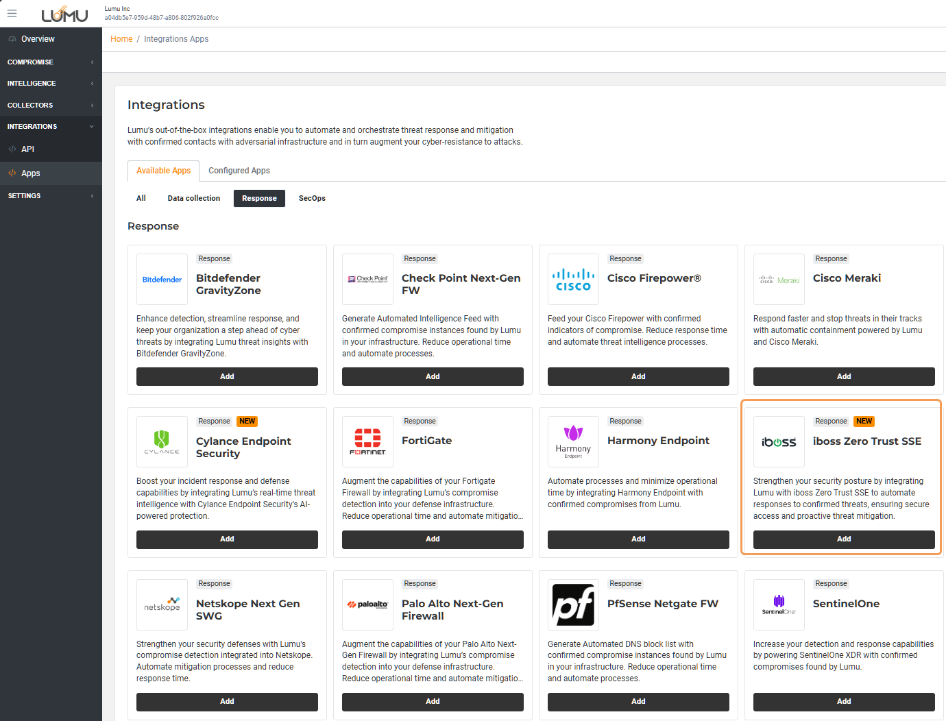 1. In the Lumu Portal, head to the panel on the left and open the Integrations drop-down menu. Then,click on Apps. Click on the Response tab on the right to filter the available integrations accordingly.2. Locate the iboss Zero Trust SSE integration. The list is organized in alphabetical order from A to Z.Click on the Add button.3. On the window that opens, familiarize yourself with the integration details as well as best use cases and requirements. Next, click the orange Activate button to start the integration setup process.4. Provide a meaningful Name. Under Threat Types, choose the specific threat mappings you want to push to iboss Zero Trust. Select the option Include IP Indicators to include IP addresses in the information sent to your feed list. When done, click on the orange Next button.