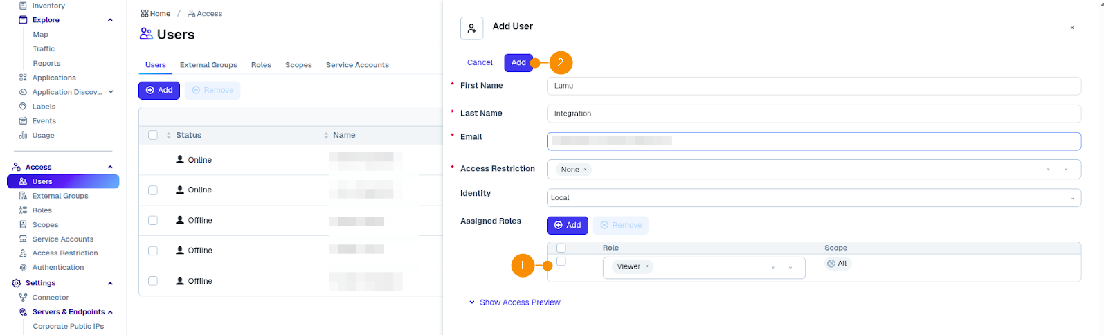 1. Go to Access (1) in the left navigation menu, and click on Users (2).