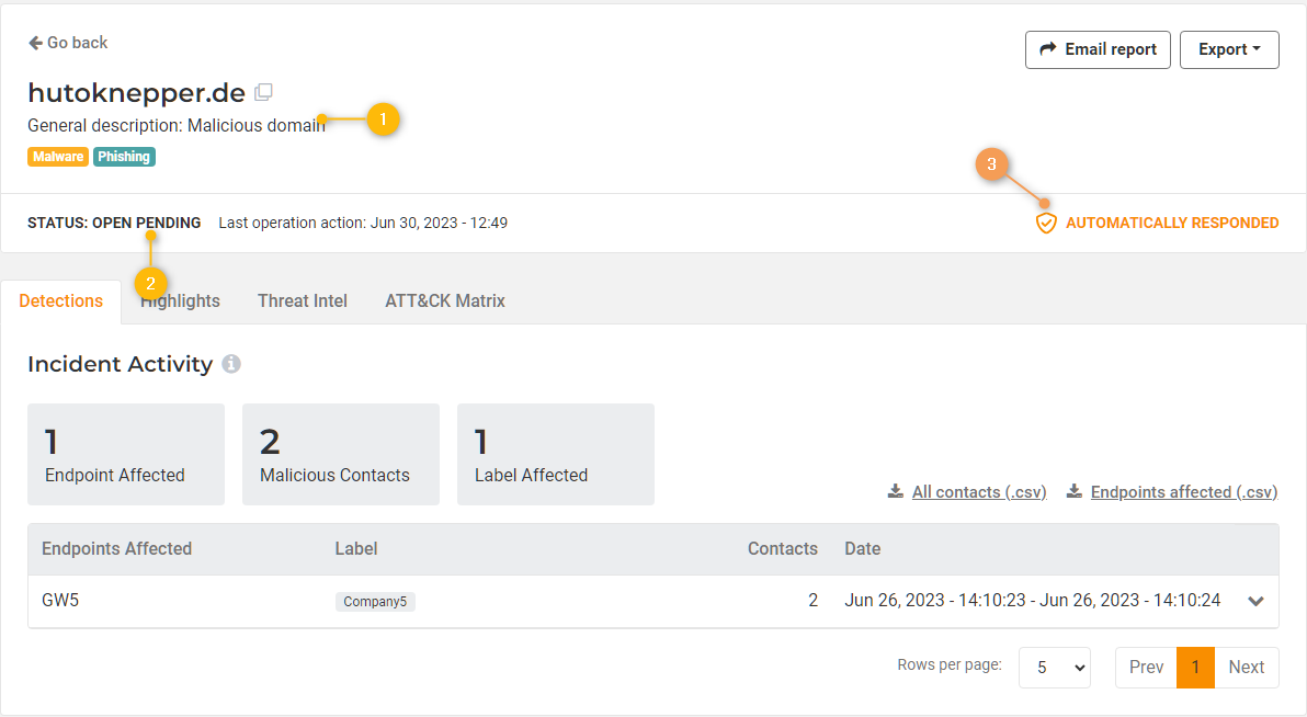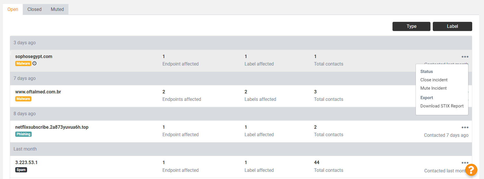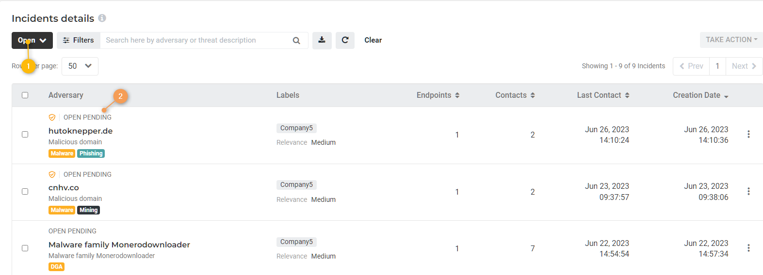 For each incident, you have the number of labels and endpoints affected and the total of contacts from that adversary. You can navigate this panel using the State of Incident filter (1).