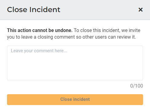 When closing an incident, please leave a comment listing the actions taken or any information related to the incident closure. That comment will be recorded, stored in the incident and shown in the Operation Timeline, then, it will be moved to the “Closed” tab.