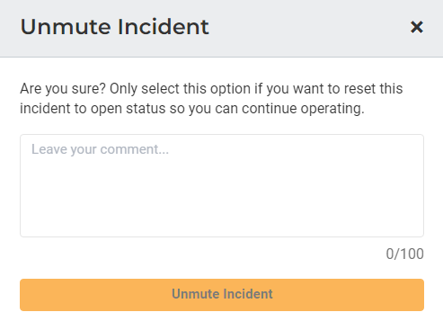 When selecting this option, you will be requested to leave a comment informing the reason you are taking this action. The comment will be recorded, stored in the incident and shown in the Operation Timeline, then, the incident will be moved to the “Muted” tab.