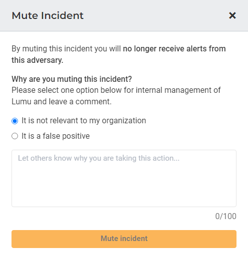 Use this option to stop new notifications of contacts from a specific adversary. First, you must select a reason to mute the incident. Here, you can choose whether to flag it as not relevant for your organization or to report it as a false positive . If you report it as a false positive, you must provide all the details and supporting evidence for why you believe it to be a false positive.
