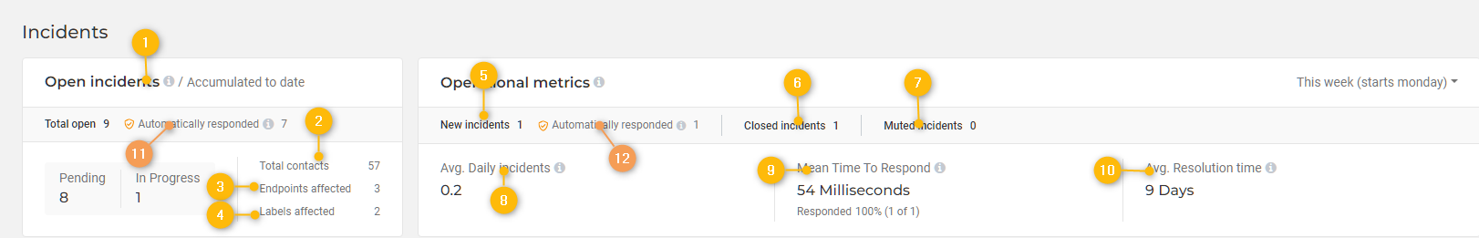 In this section of the Lumu Portal, you have a summary of the accumulated adversarial activity, such as the number of Open Incidents (1), Total Contacts (2), Endpoints Affected (3), and Affected Labels (4). On the right hand panel, called Operational Metrics, you will find the number of New Incidents (5), Closed Incidents (6), Muted Incidents (7), Average Daily Incidents (per week) (8), Mean Time To Respond - MTTR (9), and Average Resolution Time (10).