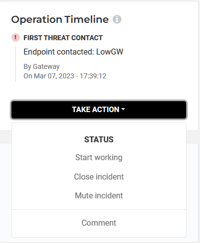 For each incident, you have the option to mark it as “In Progress”, close it, or mute it, as well as to download the incident’s information as a STIX report. You can also access this menu by using the Take Action option in the Incident Details view.