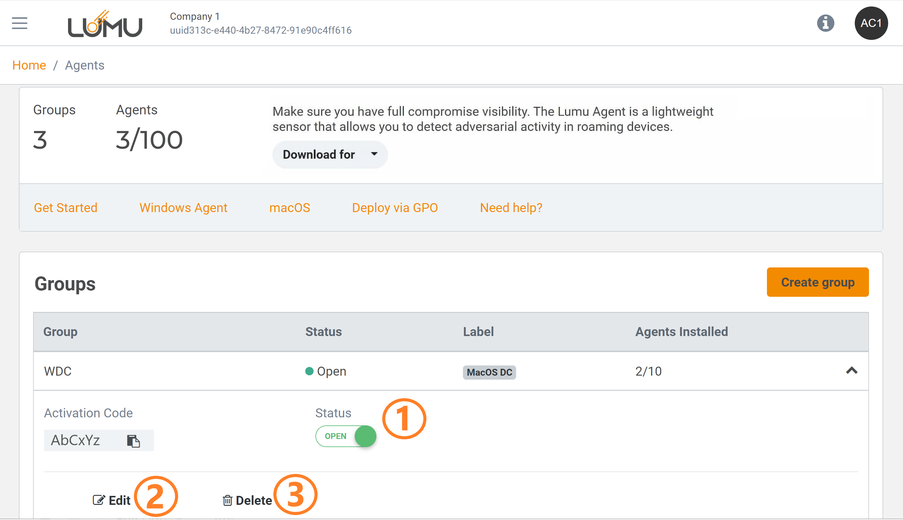 In the Group section of the Lumu Portal (1), you can manage all the installed agents in your company through groups. You can set groups by geography, domains, critical assets, or as needed. Each group will have a unique activation code for deploying agents.