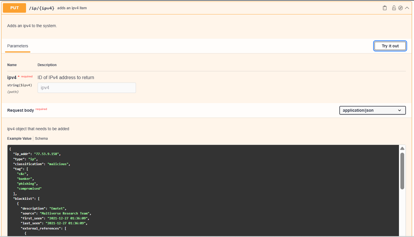 /ip/{ipv4}IpItem object containing details about the IPv4 IoC./hostname/{hostname}HostnameItem object containing details about the hostname IoC./url/{urlchecksum}UrlItem object containing URL IoC details./sample/{sha256}SampleItem object with details about the sample.The JSON you upload needs to be compliant with the structure defined in the API specification. You can review and try out the JSON structure in our API documentation.