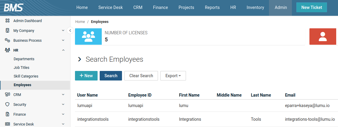 We recommend you create a dedicated user of type API Employee to operate the integration. To create it, log in to your Kaseya BMS instance with an administrator user, and follow these steps: