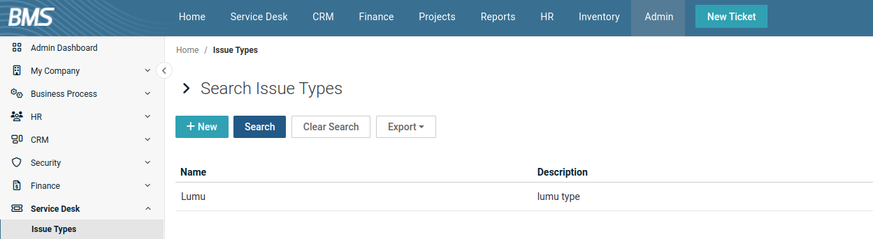 A Kaseya BMS issue type is required for ease of management. To create a dedicated issue type for Lumu, log in to your Kaseya BMS instance with an administrator user, and follow these steps: