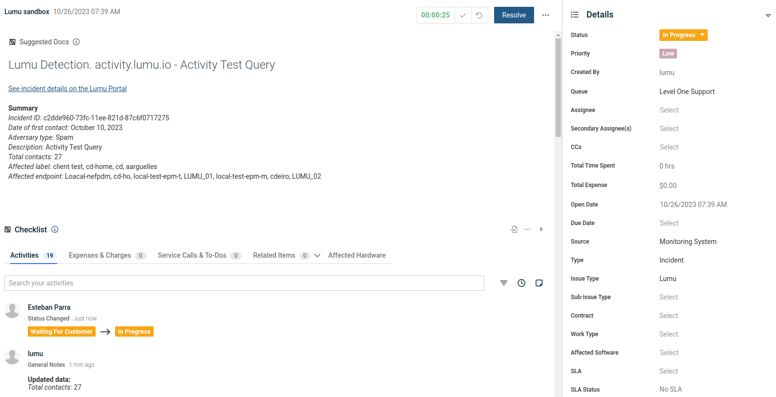 Use the following command to listen to Lumu operational events and manage service tickets in your Kaseya BMS instance: