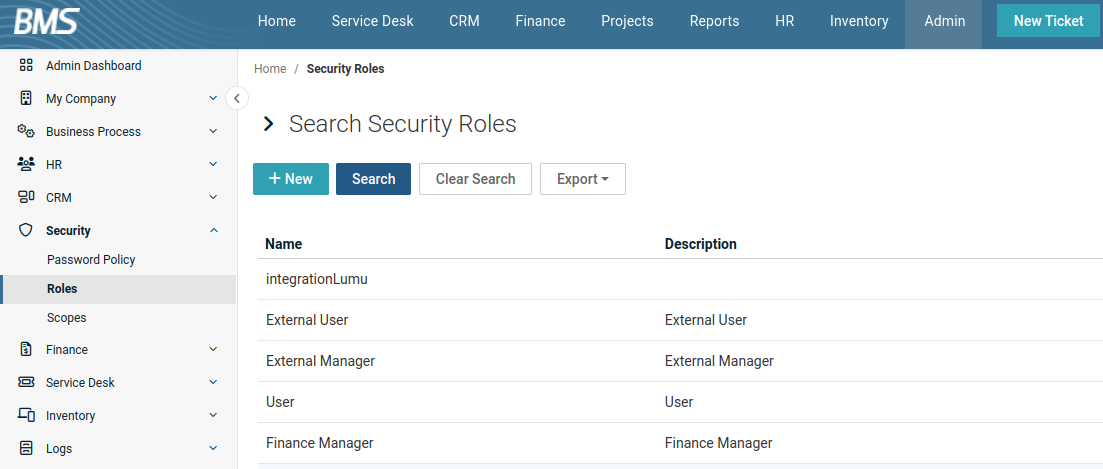 We recommend you use a custom role dedicated to running the Lumu integration. To create it, log in to your Kaseya BMS instance with an administrator user, and follow these steps: