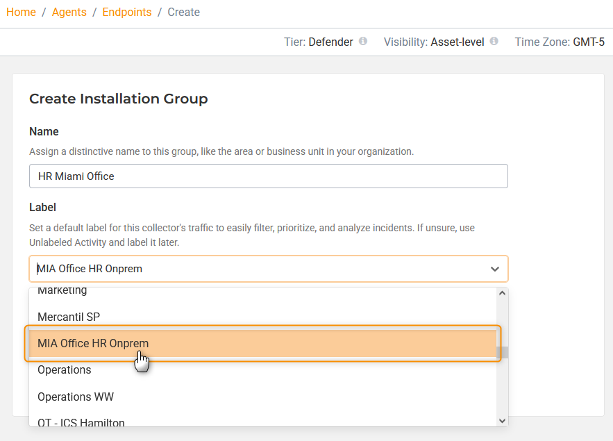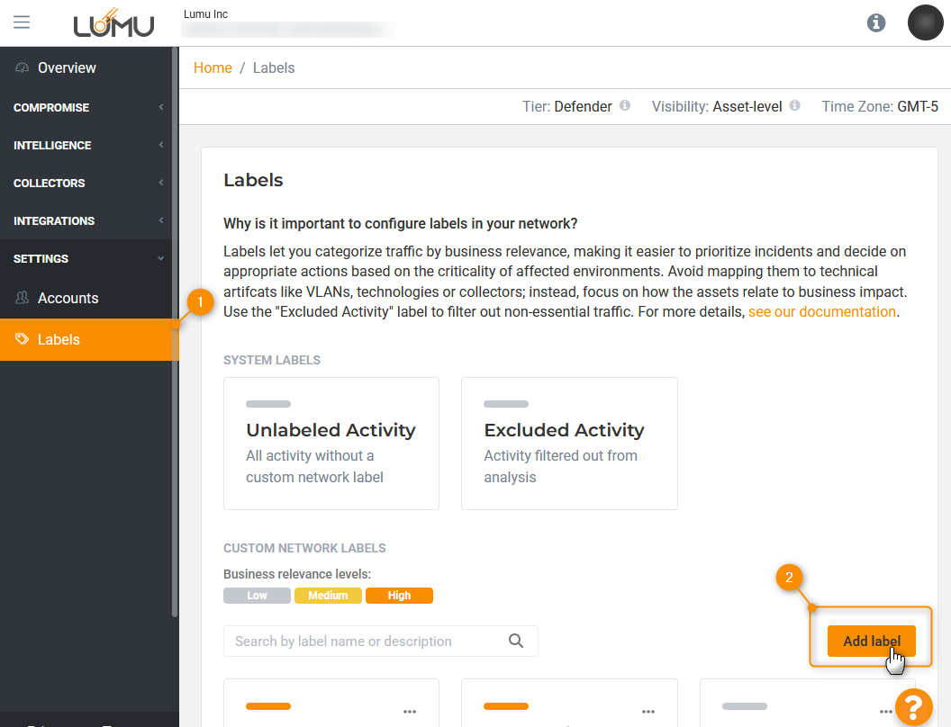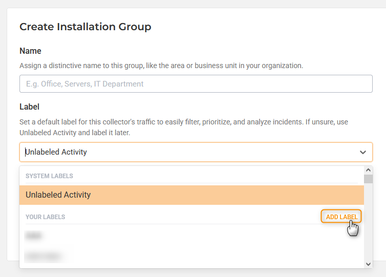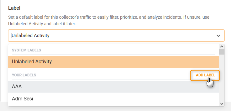 a. When creating collectors in the Lumu Portal, such as gateways, agents, virtual appliances, custom collectors, etc., you are prompted to associate their traffic with a label. Associate an existing label with the collector, or add a new label.
