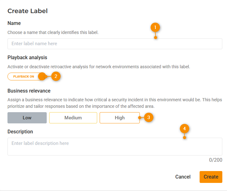 - Name(1): You must assign not only an identifiable name to your label, but one that provides as much information as possible about it at a glance. The purpose of labels is to allow the team to prioritize and operate incidents in a quick and precise way, so there must be consideration put into naming your labels. You want to consider your network segmentation and the criticality of the asset, first and foremost. Geography, organizational criteria, and others may be useful, but they will always come second in terms of importance.