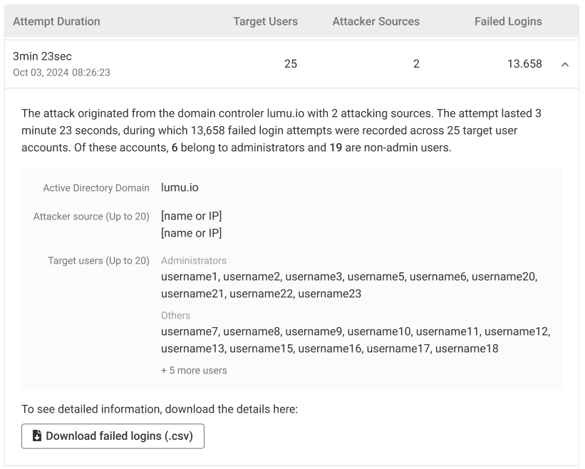Lumu is capable of detecting Login brute force activity targeting your organization's credentials. Active Directory (AD) facilitates central management by tying together servers, workstations, and applications, making it a key target for attackers. Because AD stores large amounts of identity-related data—including user permissions and passwords—attackers target it to identify valid credentials and escalate access.