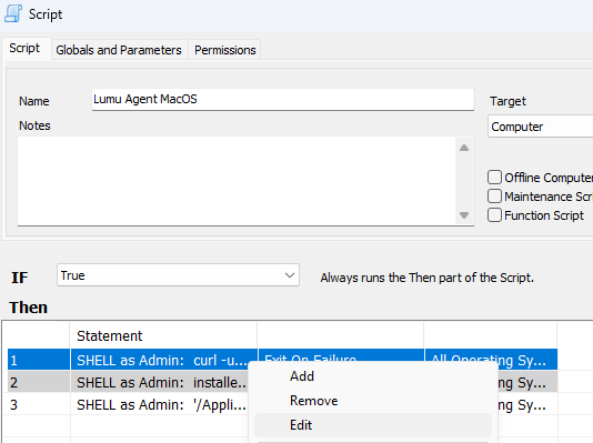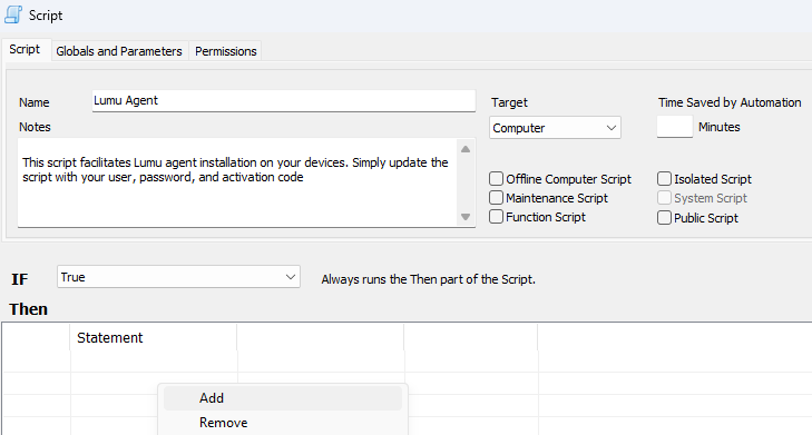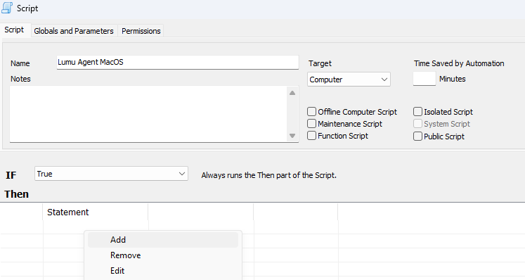 2. Name the script first. Now, pick "True" in the "IF" field. Right-click on the "Then" section under Statement, and choose to add