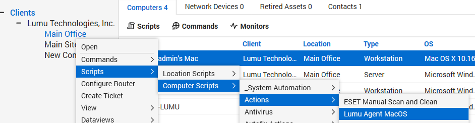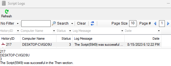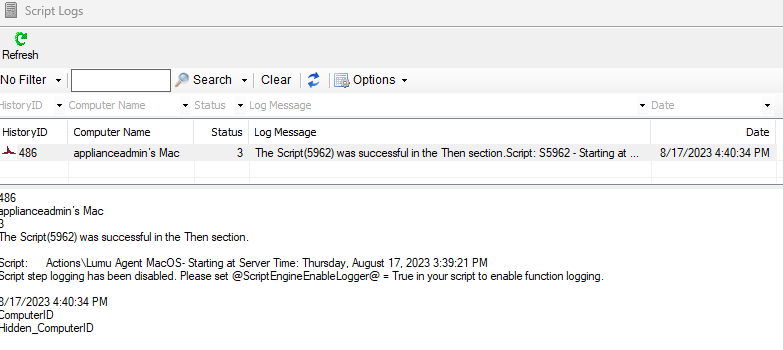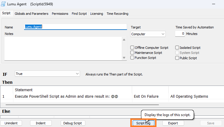 7. To verify if the Lumu Agent has been deployed, go back to Automation > Scripts > View Scripts. Select the script and then choose the option “script log”. you will see “The script was successful in the “Then” section.