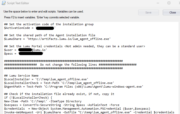 4. Don't forget to update the script, you will need to specify the activation code, as well as the Lumu/ user's username and password to match your specific credentials.