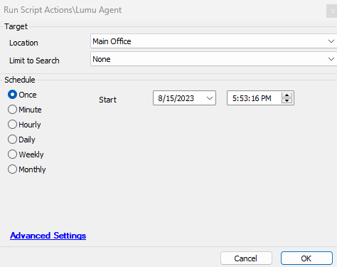 6. Click on the desired script and select "Schedule once" and specify the date and time at which the script should be executed