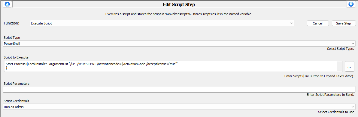 3. Open the new tab and choose "PowerShell" for the "Script type". Paste the script contents into the "Script to Execute" section. You'll find a sample PowerShell script here, or you can download it from the end of this article. Lastly, opt for "Run as Admin" in the "Script Credentials" selection.