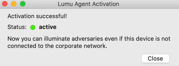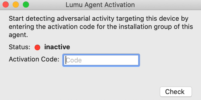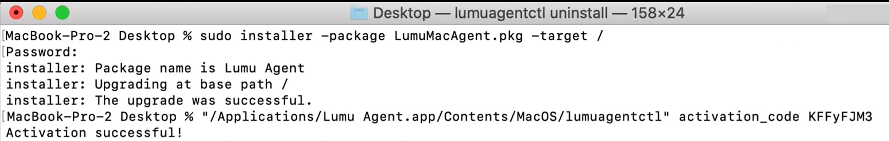 The next step is to activate the Lumu Agent using the installation path ( /Applications/Lumu Agent.app/Contents/MacOS/lumuagentctl ) and the activation code of the group . The command should look like this: