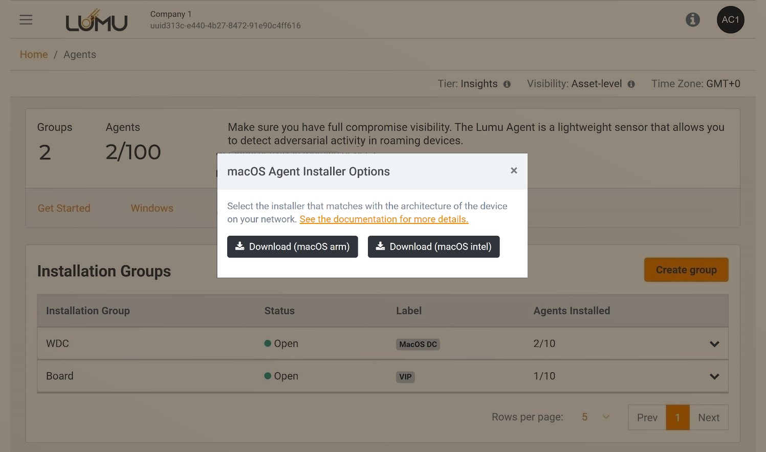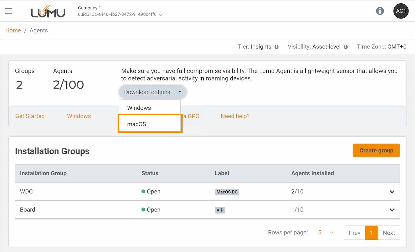 1. To download the agent file for installation on macOS, go to the Lumu Portal and navigate to the Agents menu, click to download, and select the macOS option.