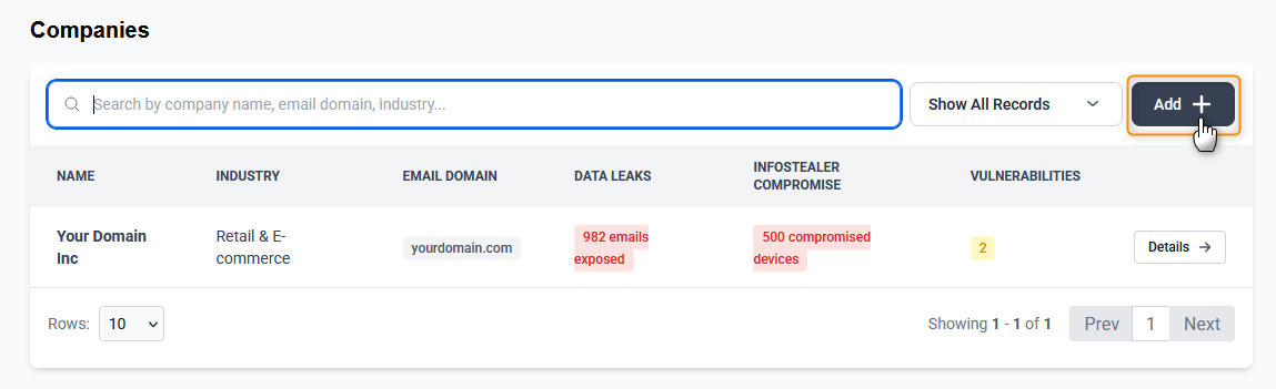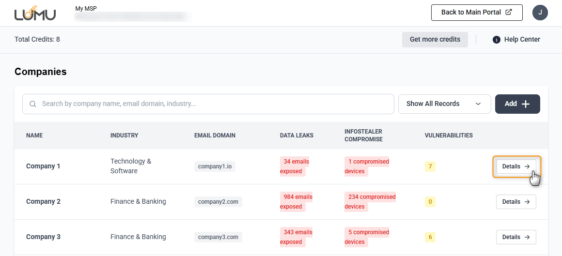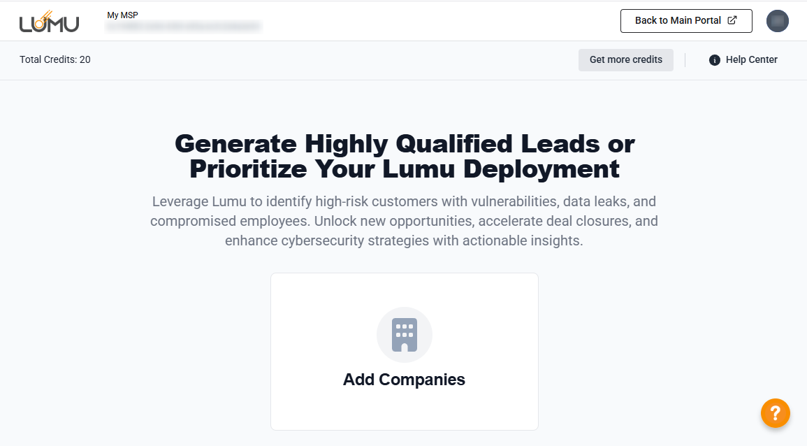 One credit from your account will be used whenever you unlock an added domain or sync the domain’s information. Your MSP will have a monthly allotment of credits that will vary depending on your MSP’s minimum endpoint commitment. The higher your commitment, the more credits your account will be granted each month. This example account will have 20 credits. This is important because you must adequately ration your credits when adding companies and their domains to your MSP’s Lumu Discover module.