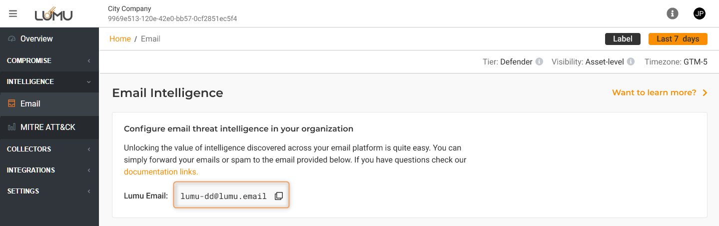 1. Lumu assigns a unique email address to your organization. You can find the email address assigned to your organization by going to the Lumu Portal and navigating to Lumu Email under the Intelligence sub-menu.