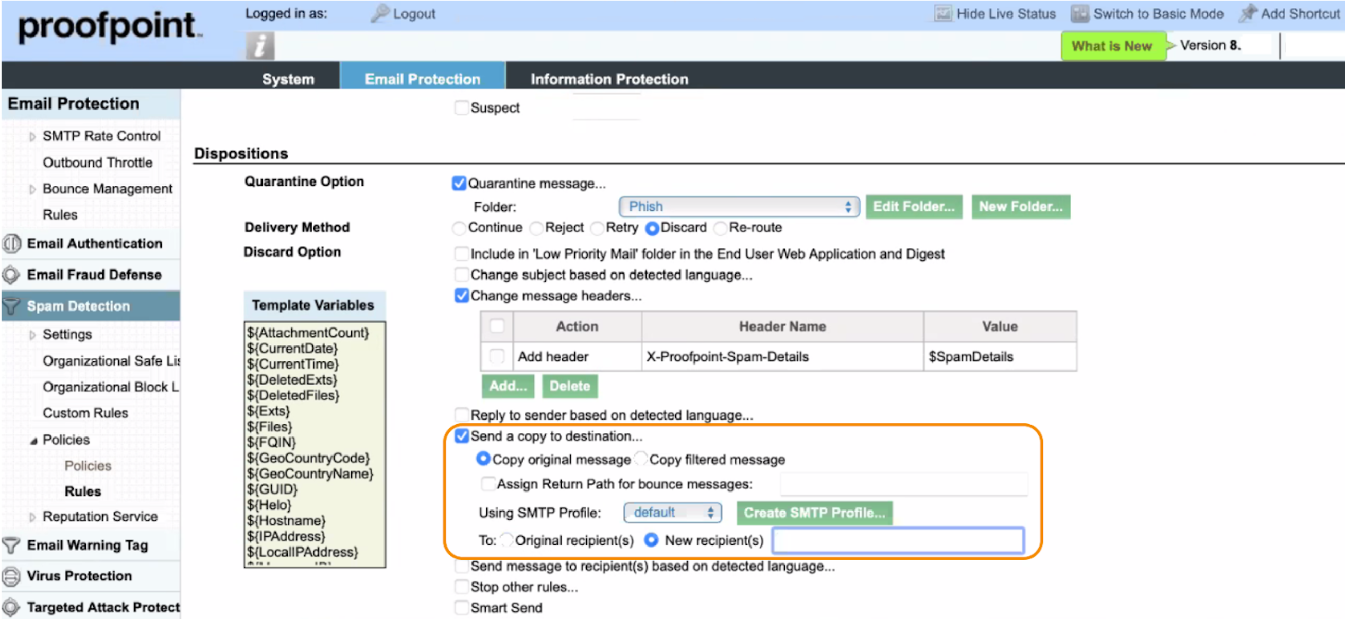 For further details about the Spam Detection settings, consult the Proofpoint documentation