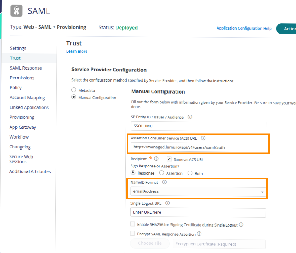 3. Open the newly created SAML app, go to the Trust menu, gather the following information and share it with Lumu Support:
