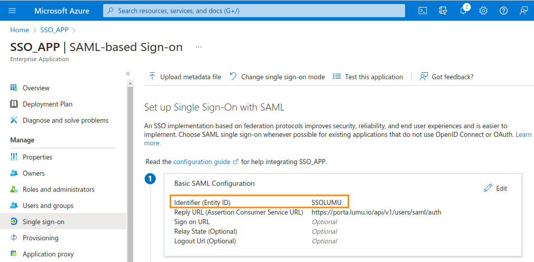 5. Next, click on Basic SAML Configuration on the pen icon to edit.