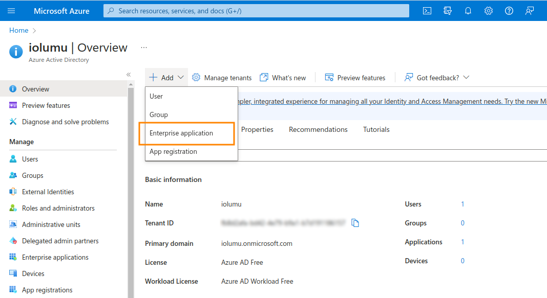 2. Click on the Add menu to open it, and select Enterprise Application.