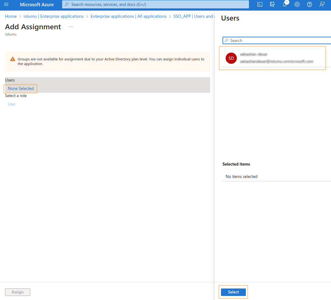 In the next step, click on None Selected and select the users you want to add to your app. Click on the Select button at the bottom to add the selected users.