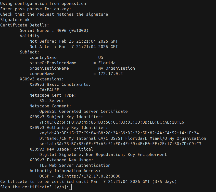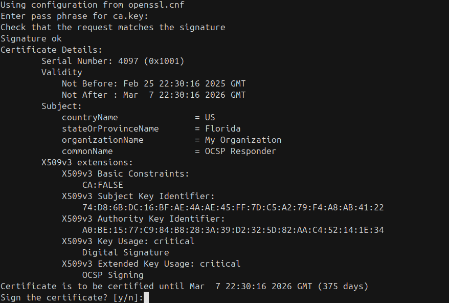 Review that the information matches with the signing request. After checking all the information, press the y key and then Enter. Again, press the y key and then Enter. Now, you will have a new file, ocsp.pem. This file is the digital certificate for your OCSP responder service.