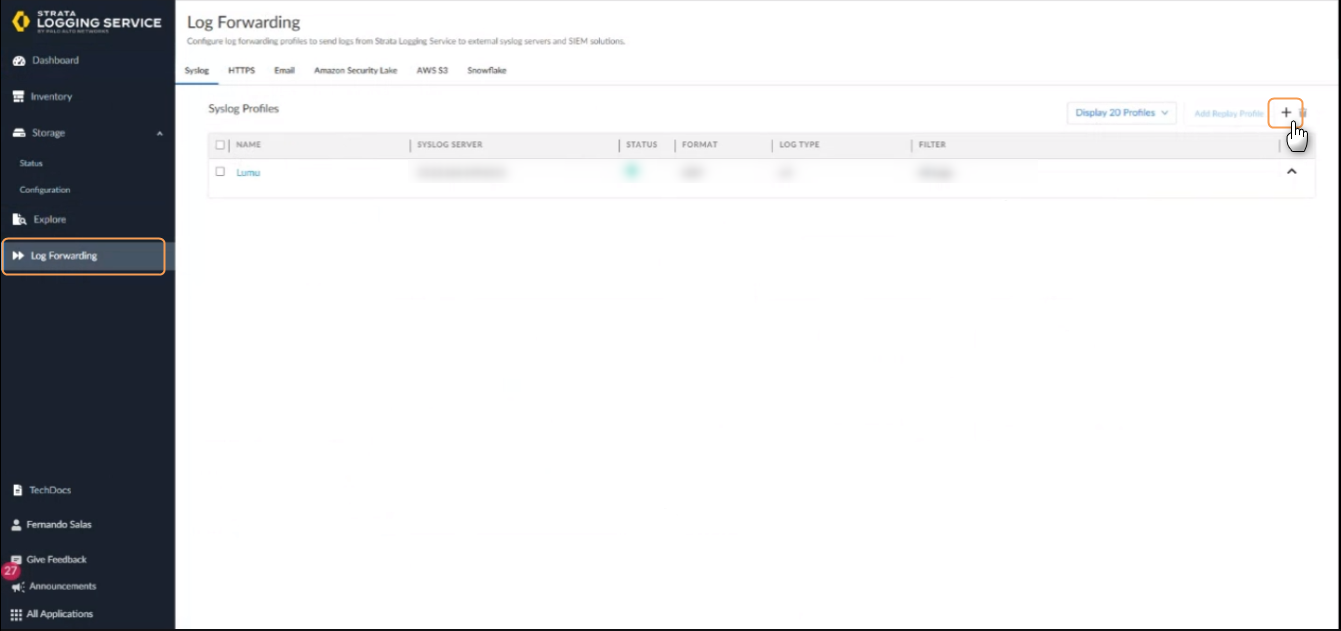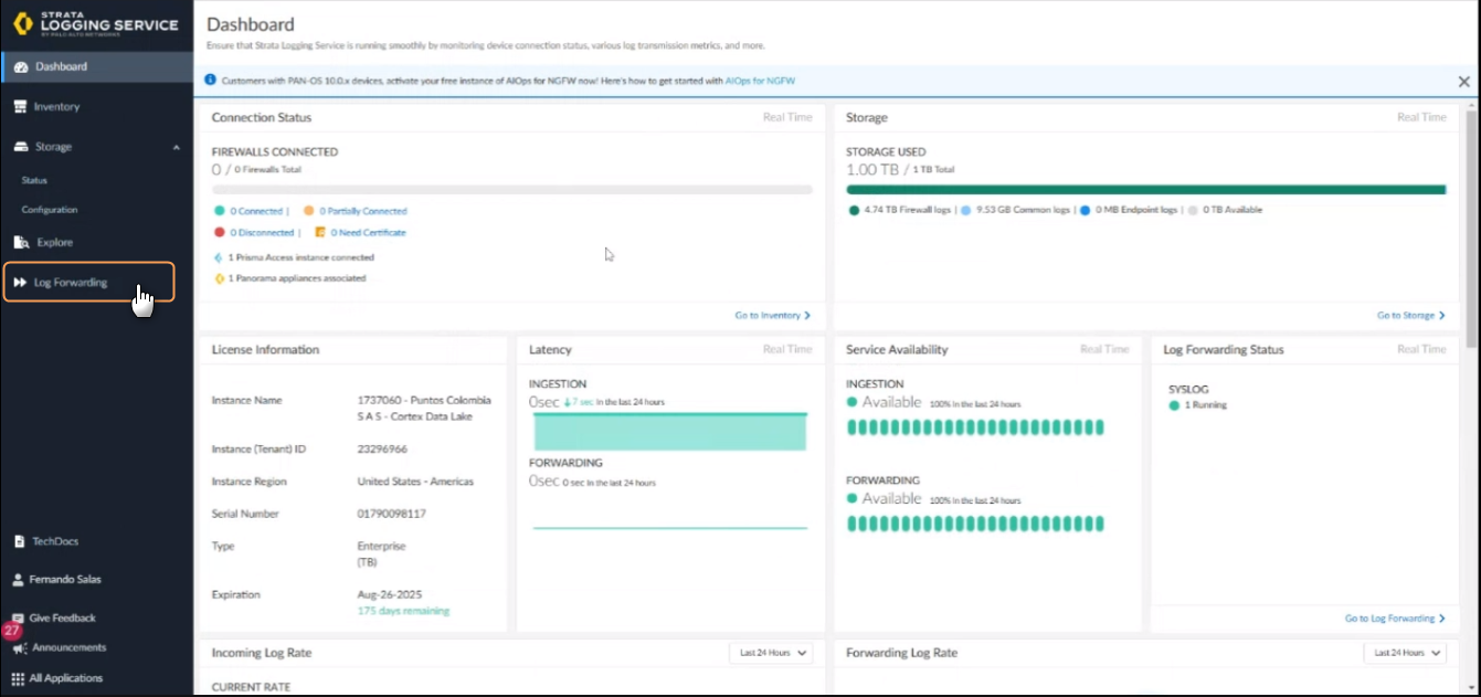 If you are using Strata Cloud Manager to manage Strata Logging Service, click on Settings > Strata > Logging Service > Log Forwarding.