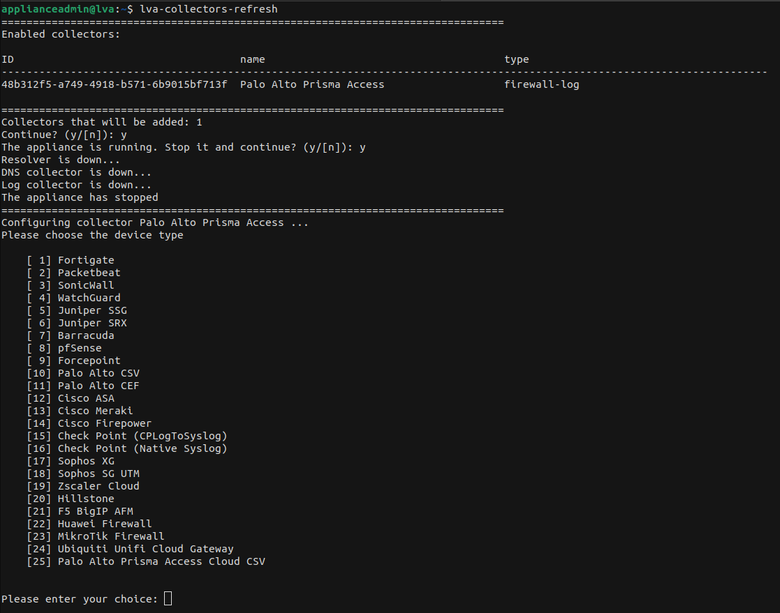 Go to the Lumu Virtual Appliance and refresh the VA Collectors settings by running the command lumu-appliance collectors refresh. If the appliance is running, it must be stopped in order to continue the setup process.