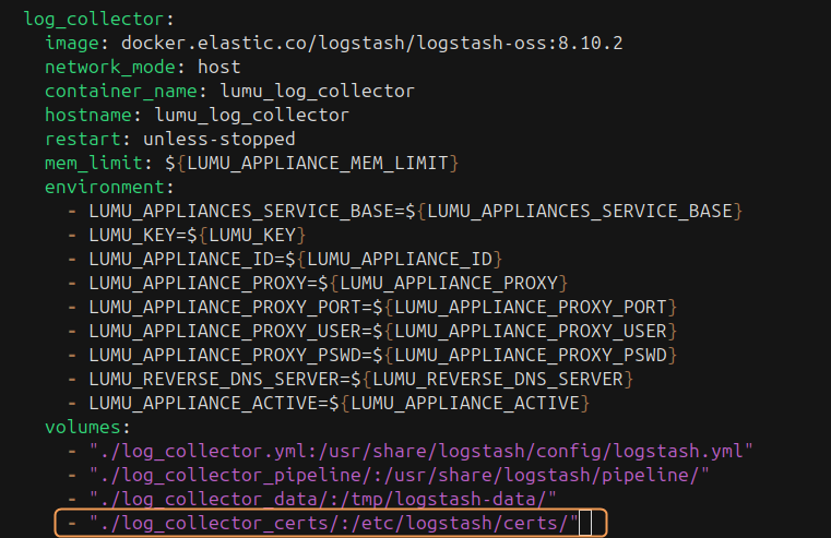 Remember to replace the VA_VERSION with the string extracted in step 3.5. Add a new volume mapping to your new certificate path from step 3 by editing your docker-compose.yml file. Look for the volumes section under the log_collector configuration block. This block looks as follows: